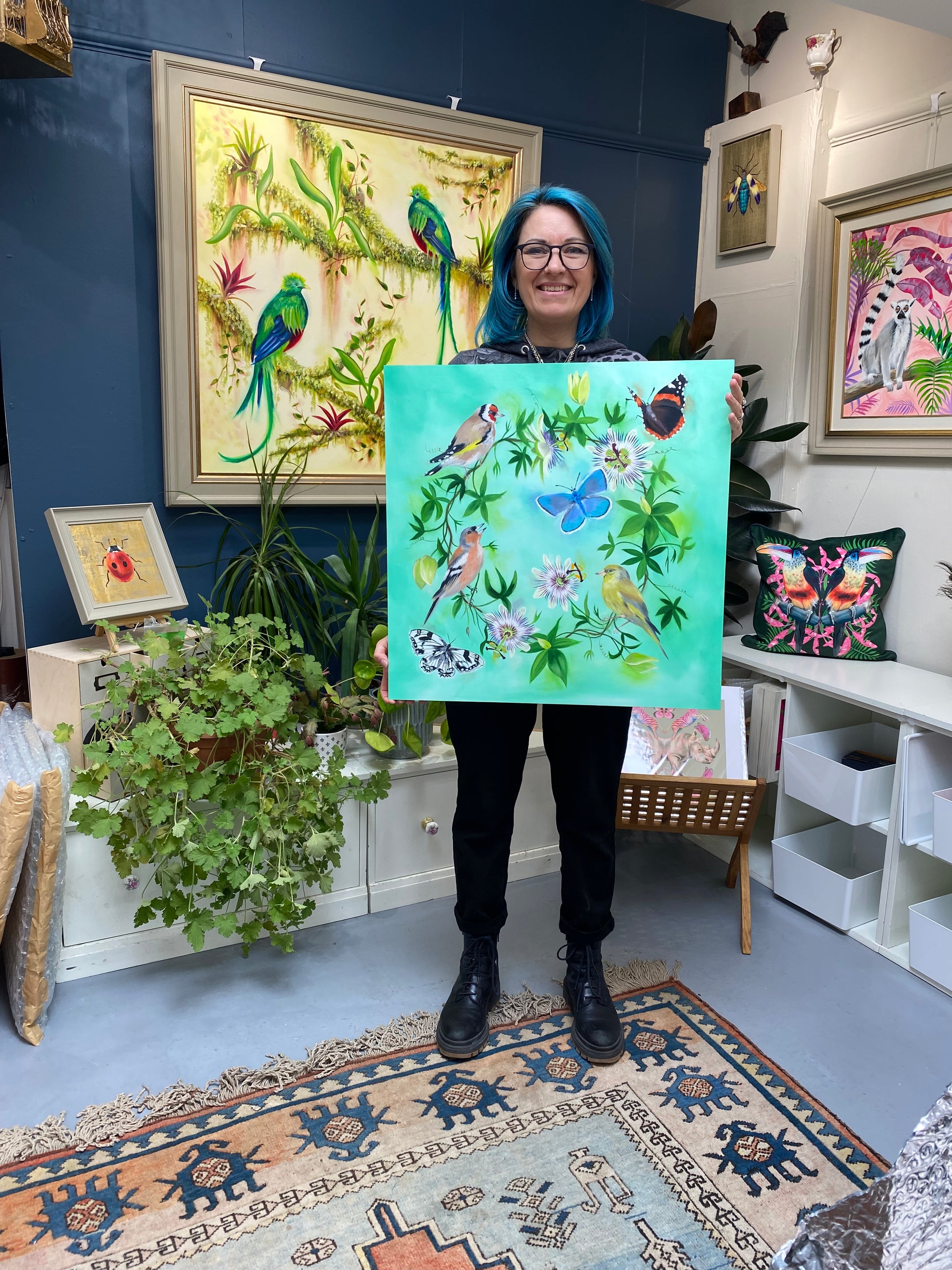 Inspired by UK birds and butterflies, this print includes a Goldfinch, chaffinch and greenfinch with a red admiral, common blue and a marbled white butterfly. The fresh minty green of the background compliments the wildlife beautifully and the passion flowers add a touch of floral elegance. A charming array of birds and butterflies to make you smile!