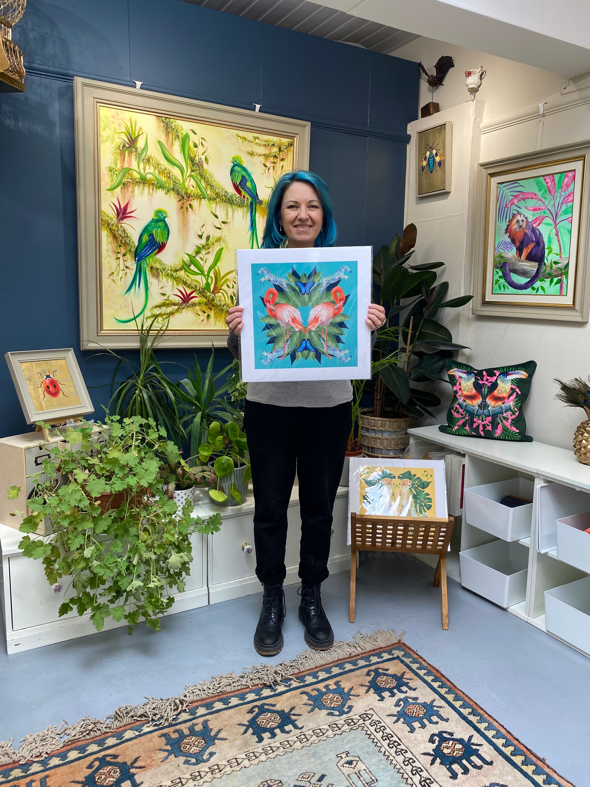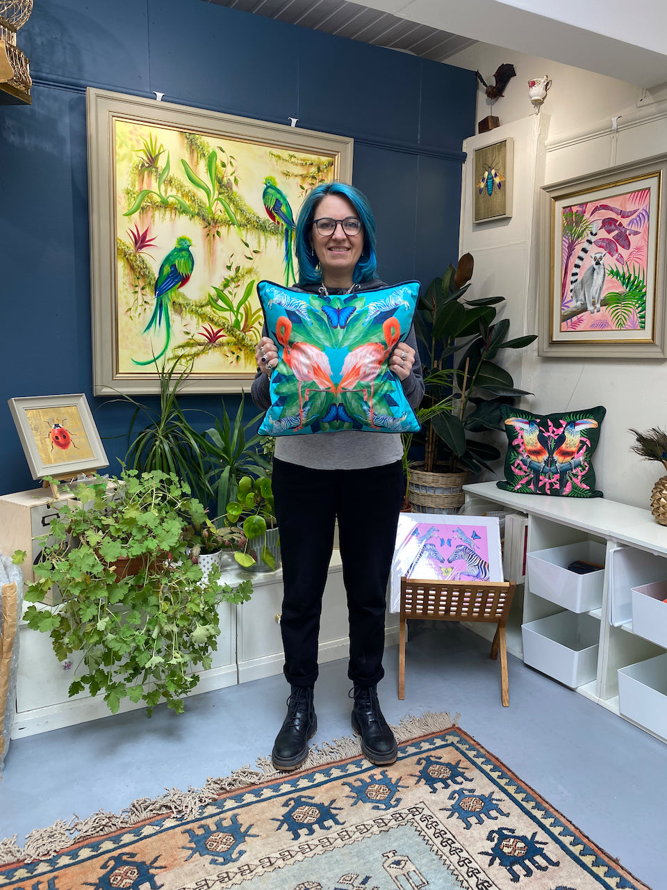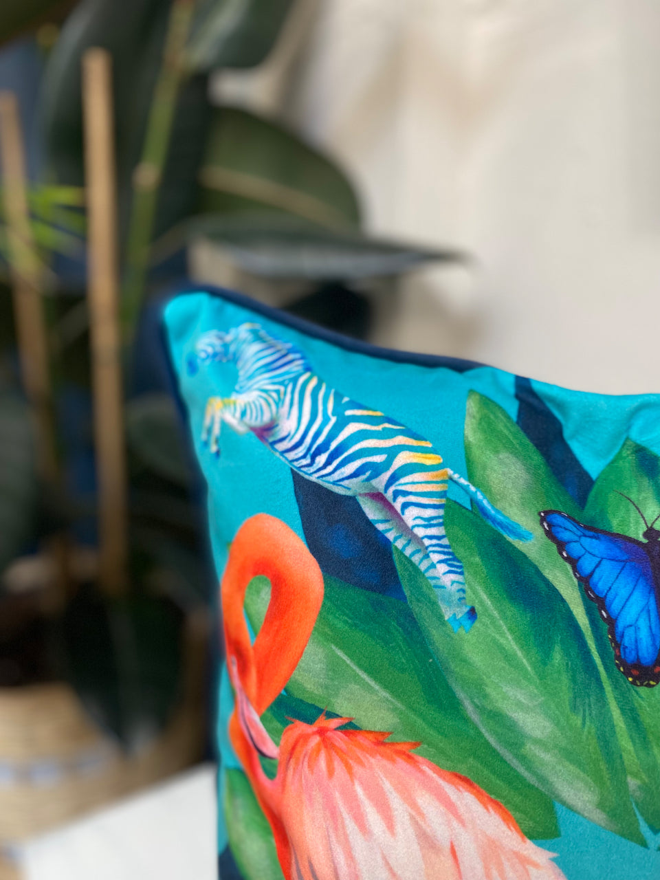 Add a touch of elegance to your living space with my luxurious velvety cushions. Wonderfully plush with a feather filled interior and a hidden zipper, allowing easy removal for machine washing. This quirky design features flamingos with blue zebras on a rich turquoise background. The piping and the back of the cushion are a rich dark blue.