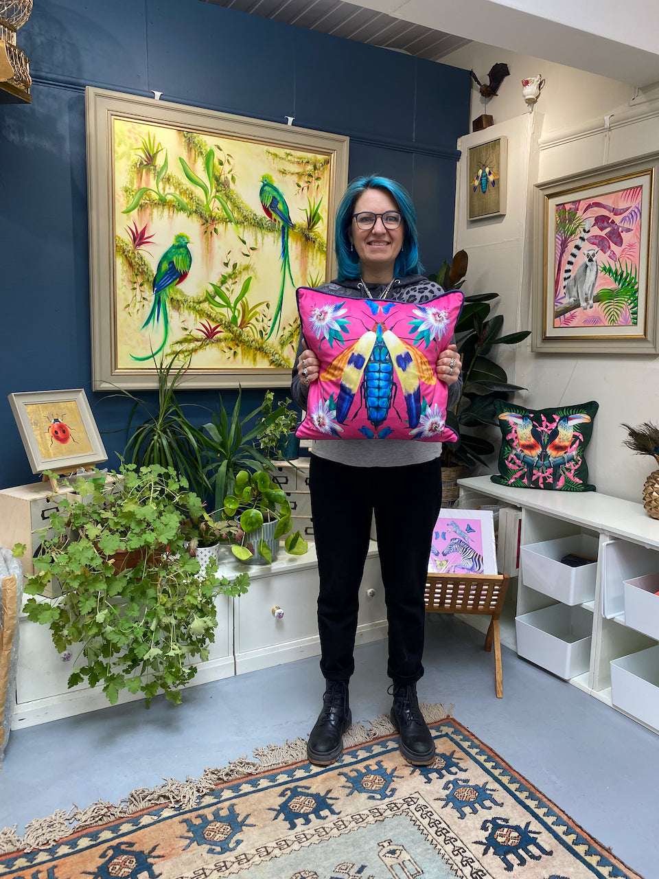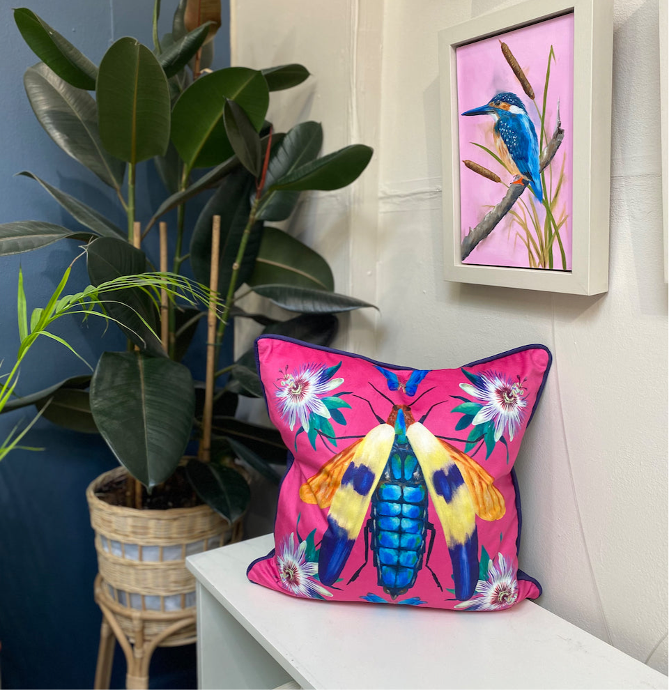 Add a touch of elegance to your living space with my luxurious velvety cushions. Wonderfully plush with a feather filled interior and a hidden zipper, allowing easy removal for machine washing. This design features a jewel beetle motif with passion flower accents on a rich pink background. The piping and the back of the cushion are dark blue.