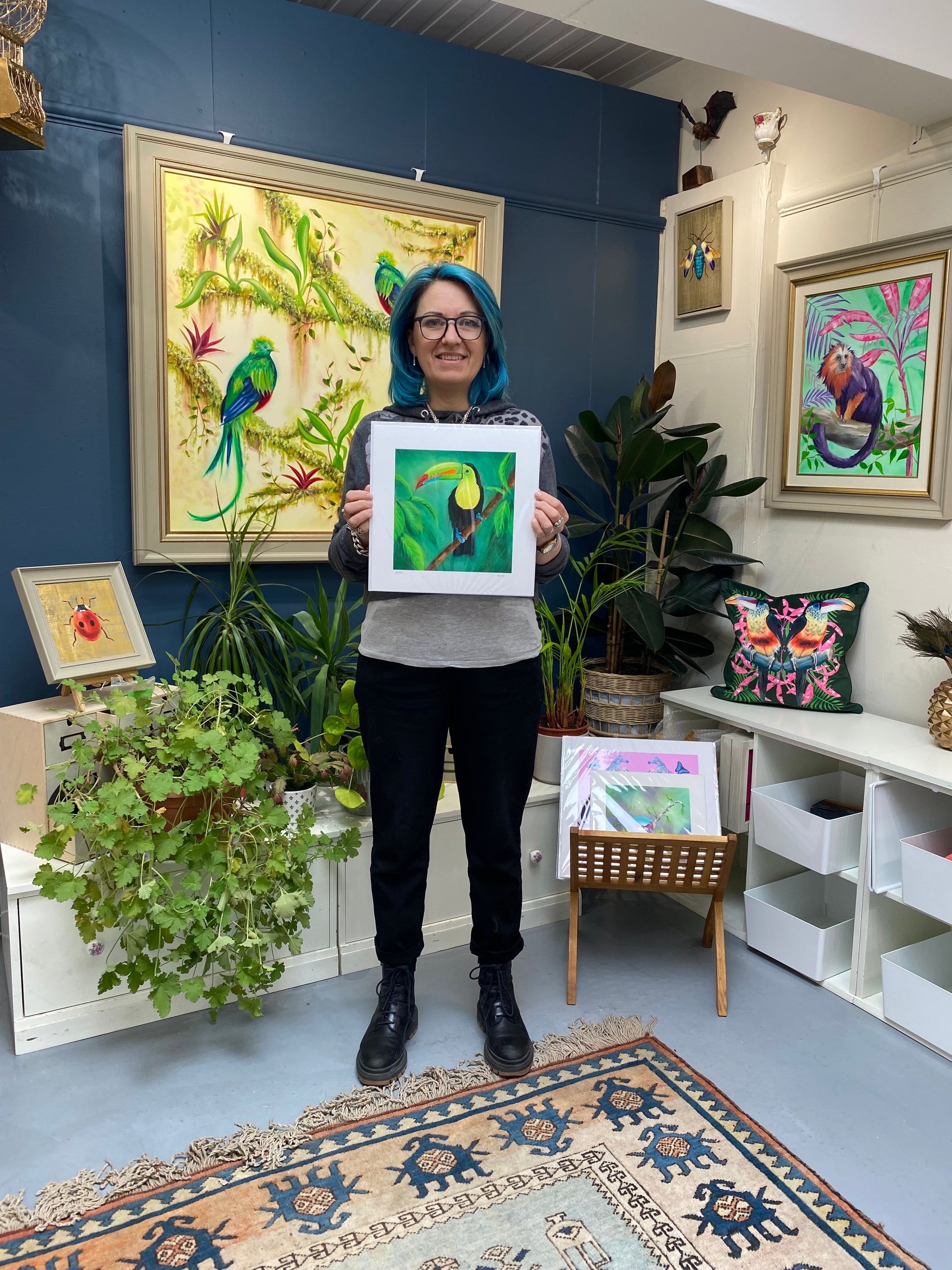 This classic tropical rainforest bird sits majestically on a branch, proudly displaying his brightly coloured beak for all to see, with a backdrop of lush green vegetation. A must for bird lovers and colour lovers alike.