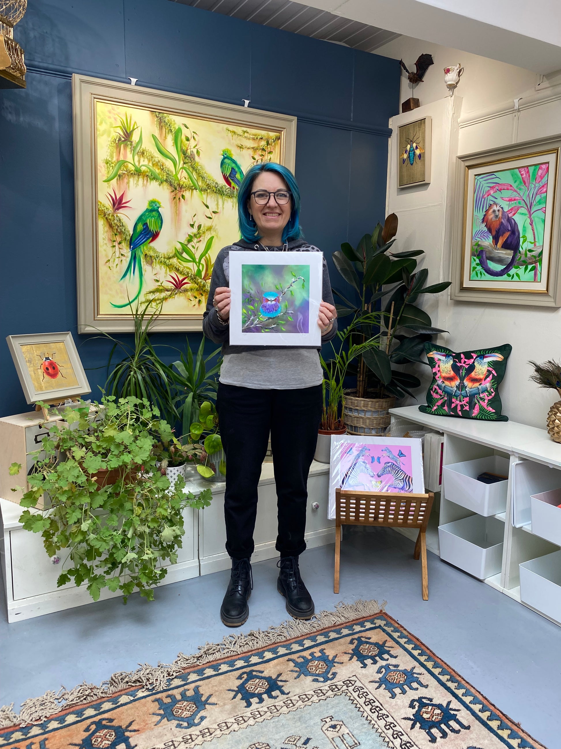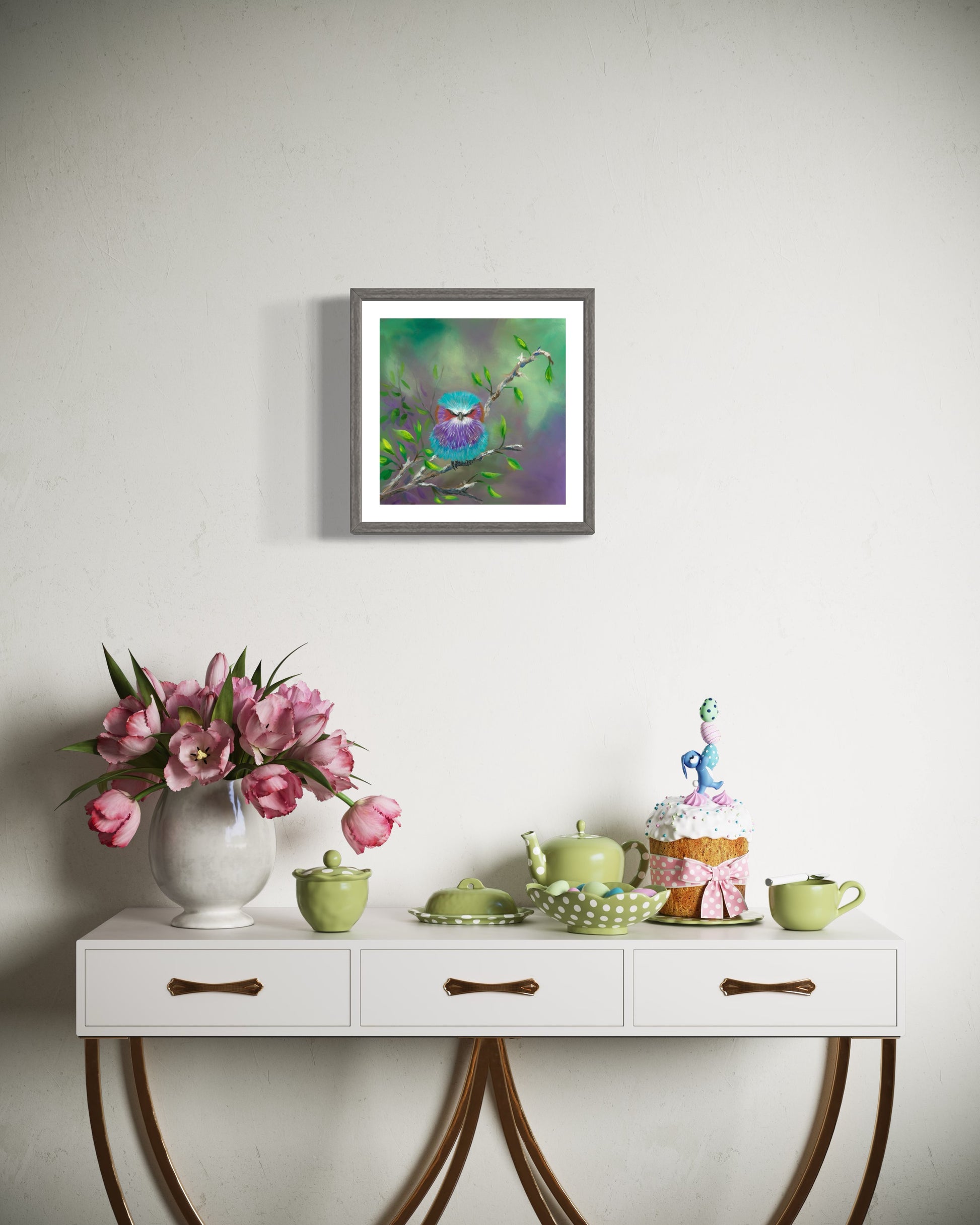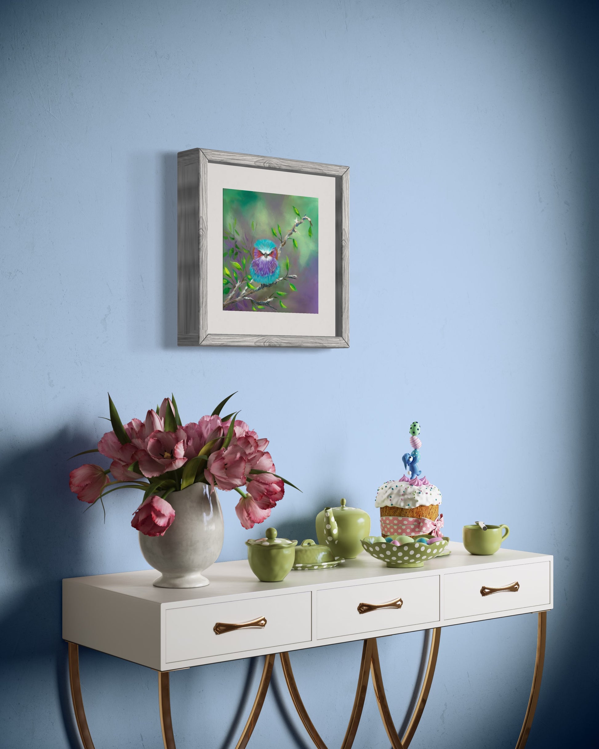 This cheeky little chap is looking straight out at you, ruffling his feathers after a rainfall. Striking a pose in his glorious turquoise and lilac plumage, this delightful little bird is a joyful addition to any home.