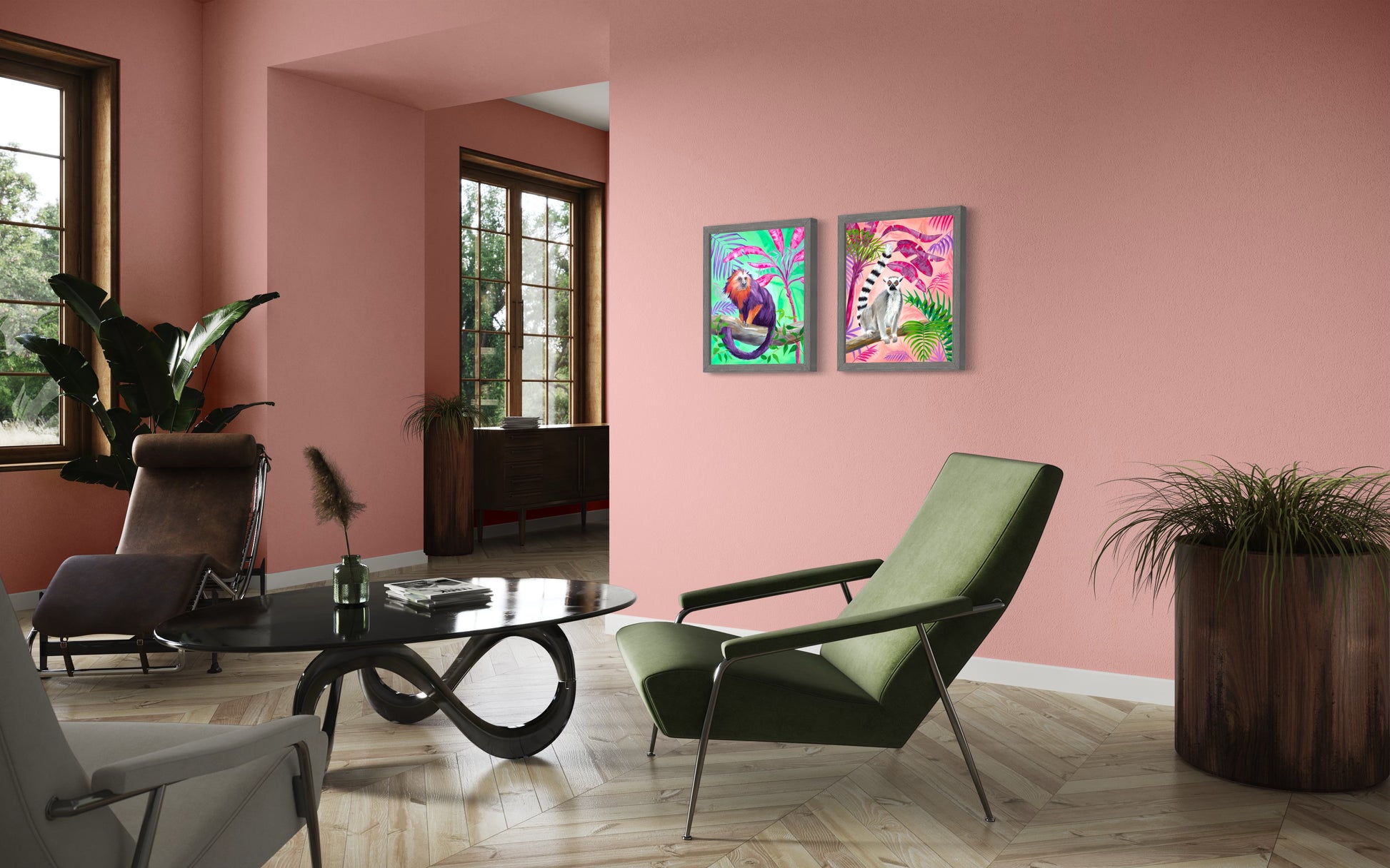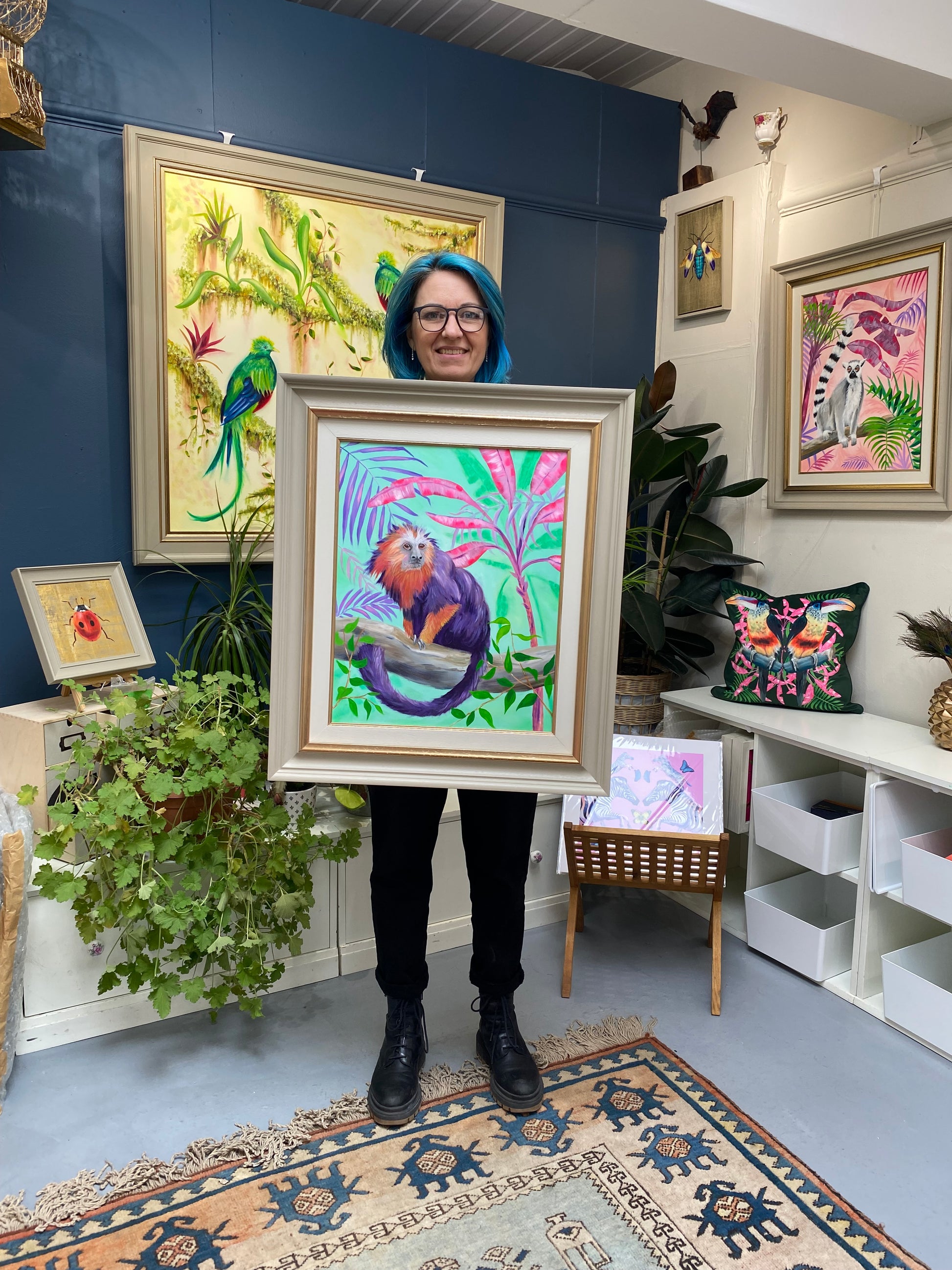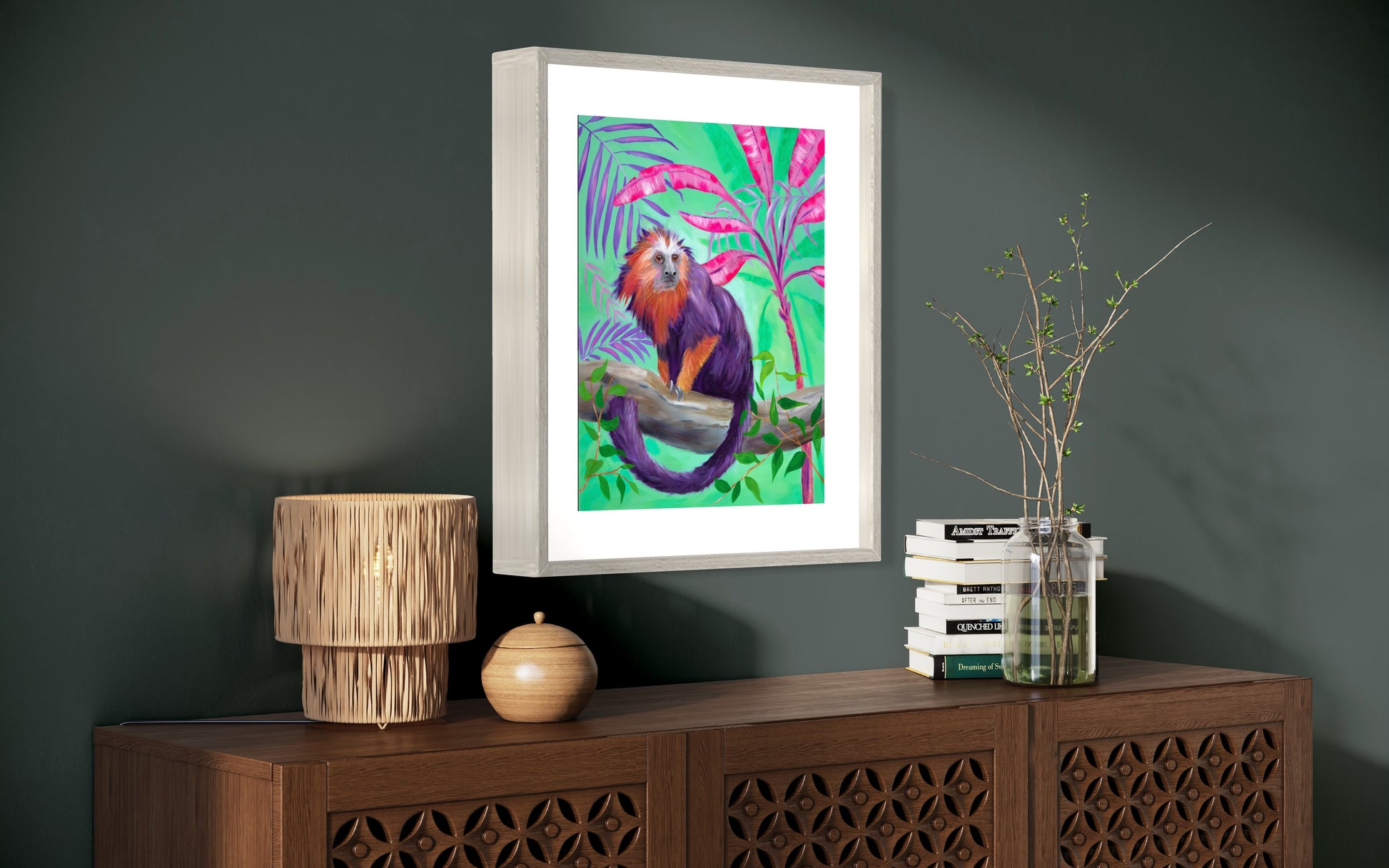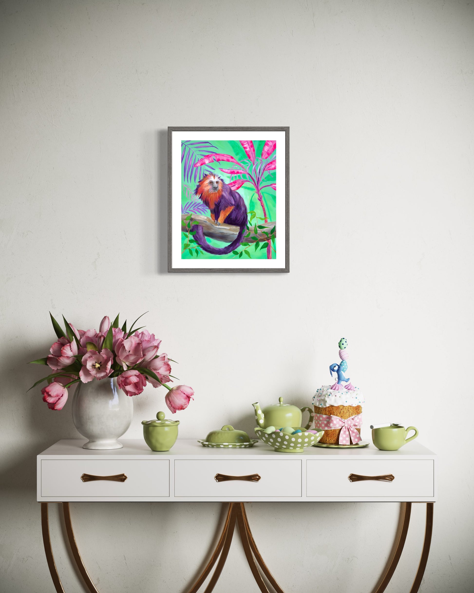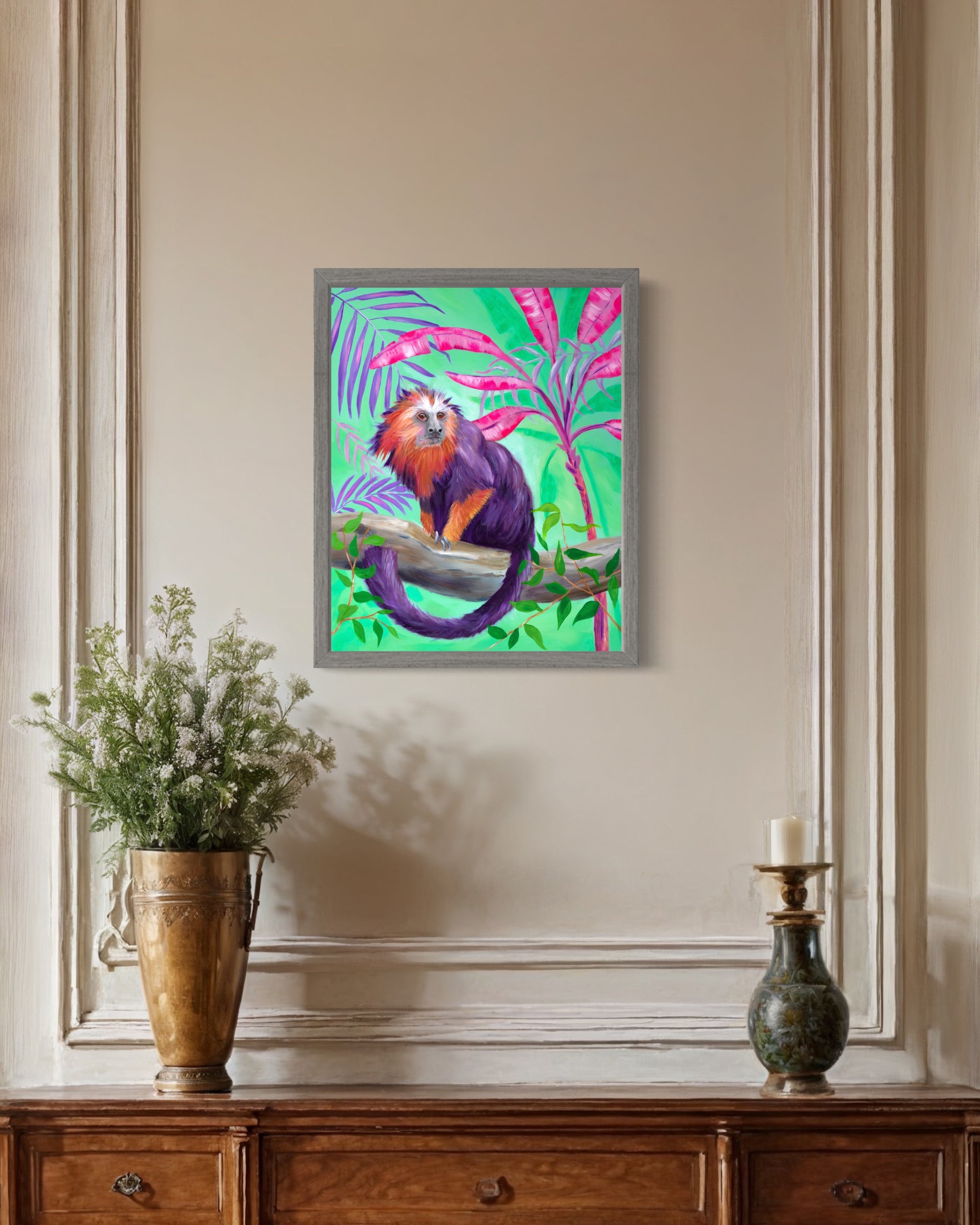 This cheeky Lion Tamarin monkey sits perfectly poised on a branch in the middle of the jungle. It is bought to life with a whimsical palette of purples and vibrant oranges. The lush vegetation is represented playfully using pinks and purples on a mint green backdrop. Embrace with wild charm of this captivating print.