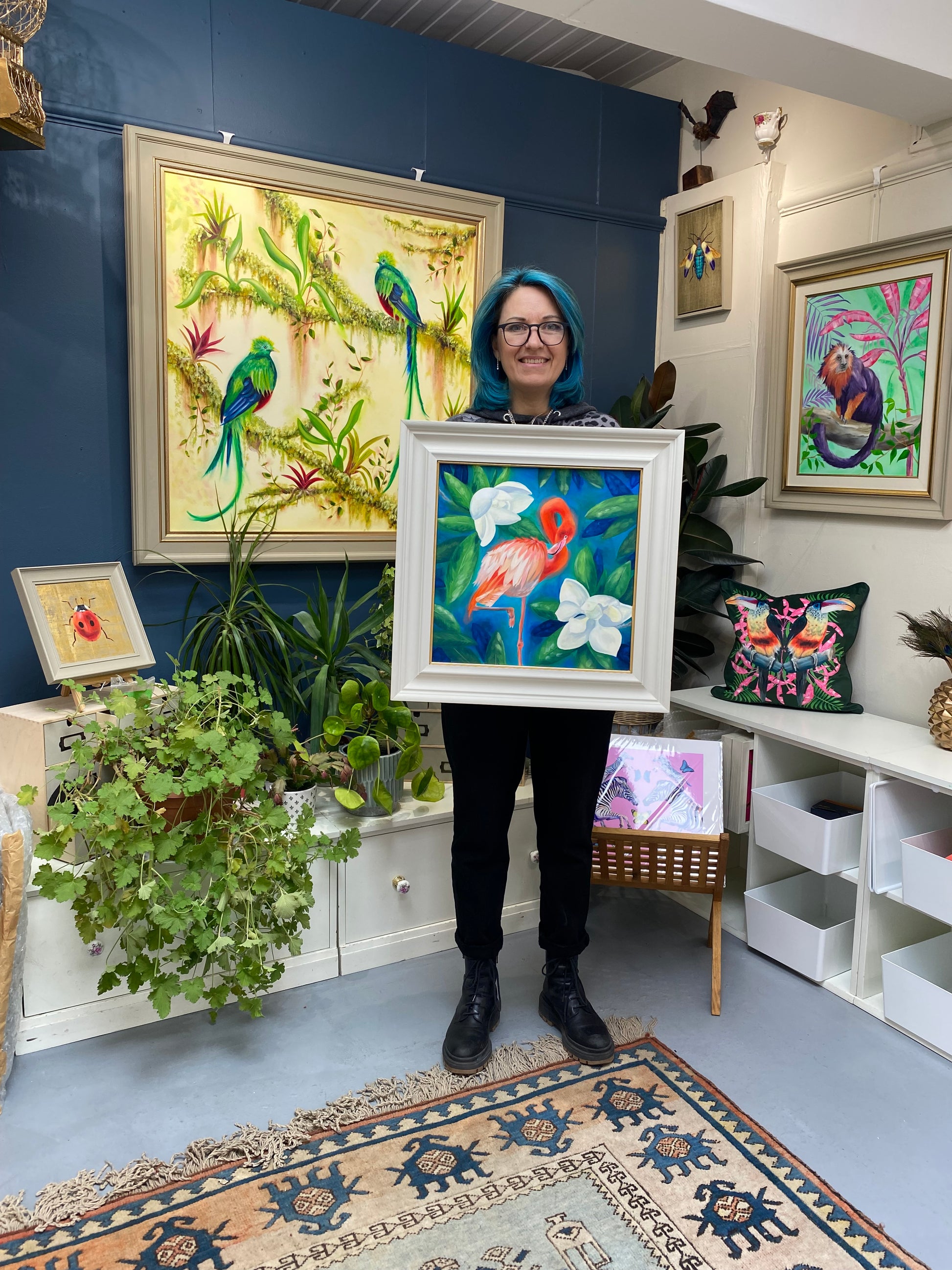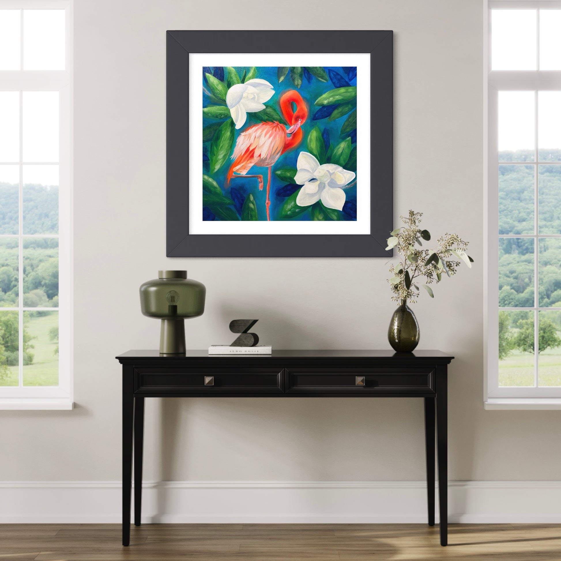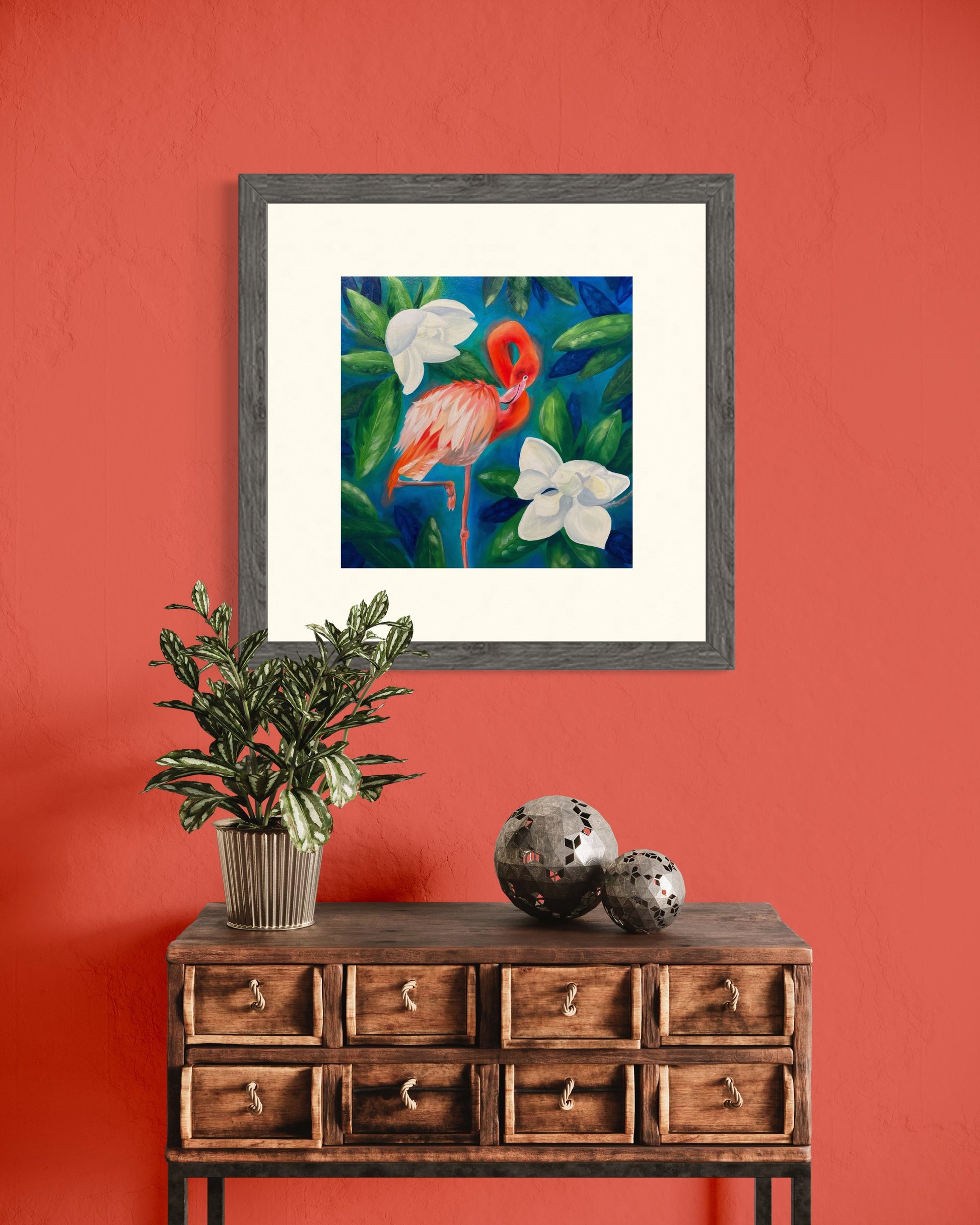Our whimsical Flamingo sits with two blooms from a magnolia grandiflora, with deep green leaves on a petrol blue background. The orange and peachy hues, perfectly compliment the petrol blues and deep greens and, defying conventional proportions, this enchanting piece brings a splash of colour and a touch of eccentricity to any space.