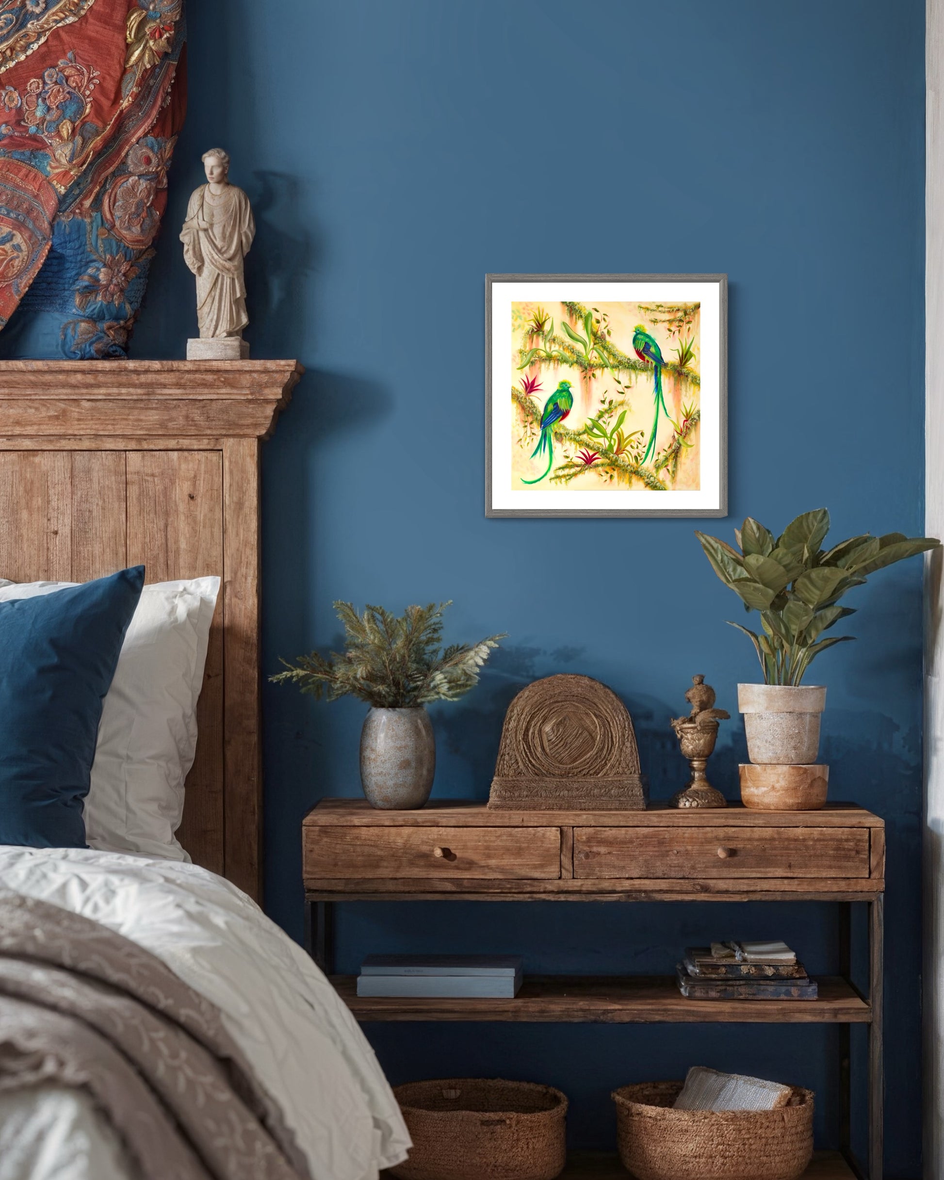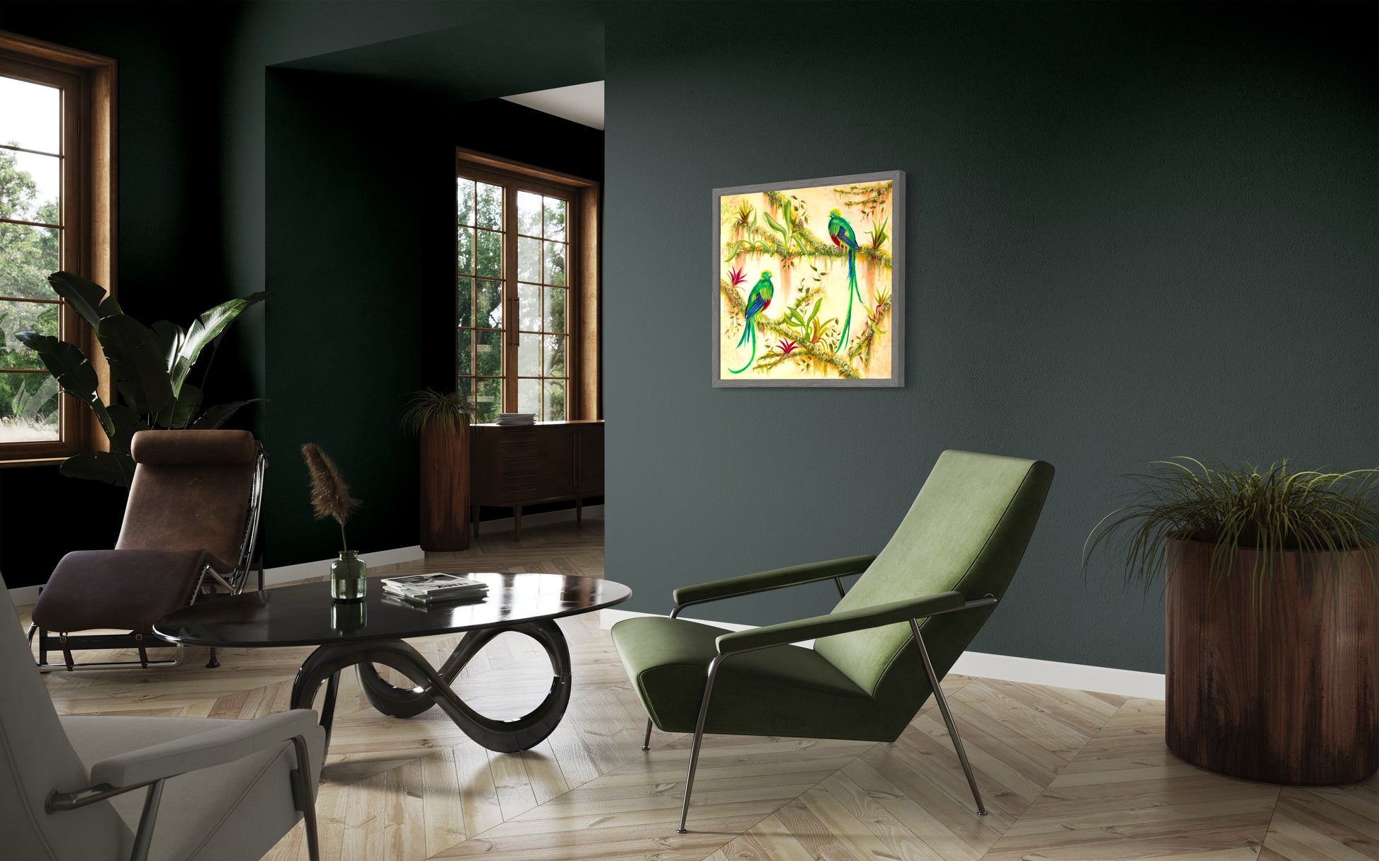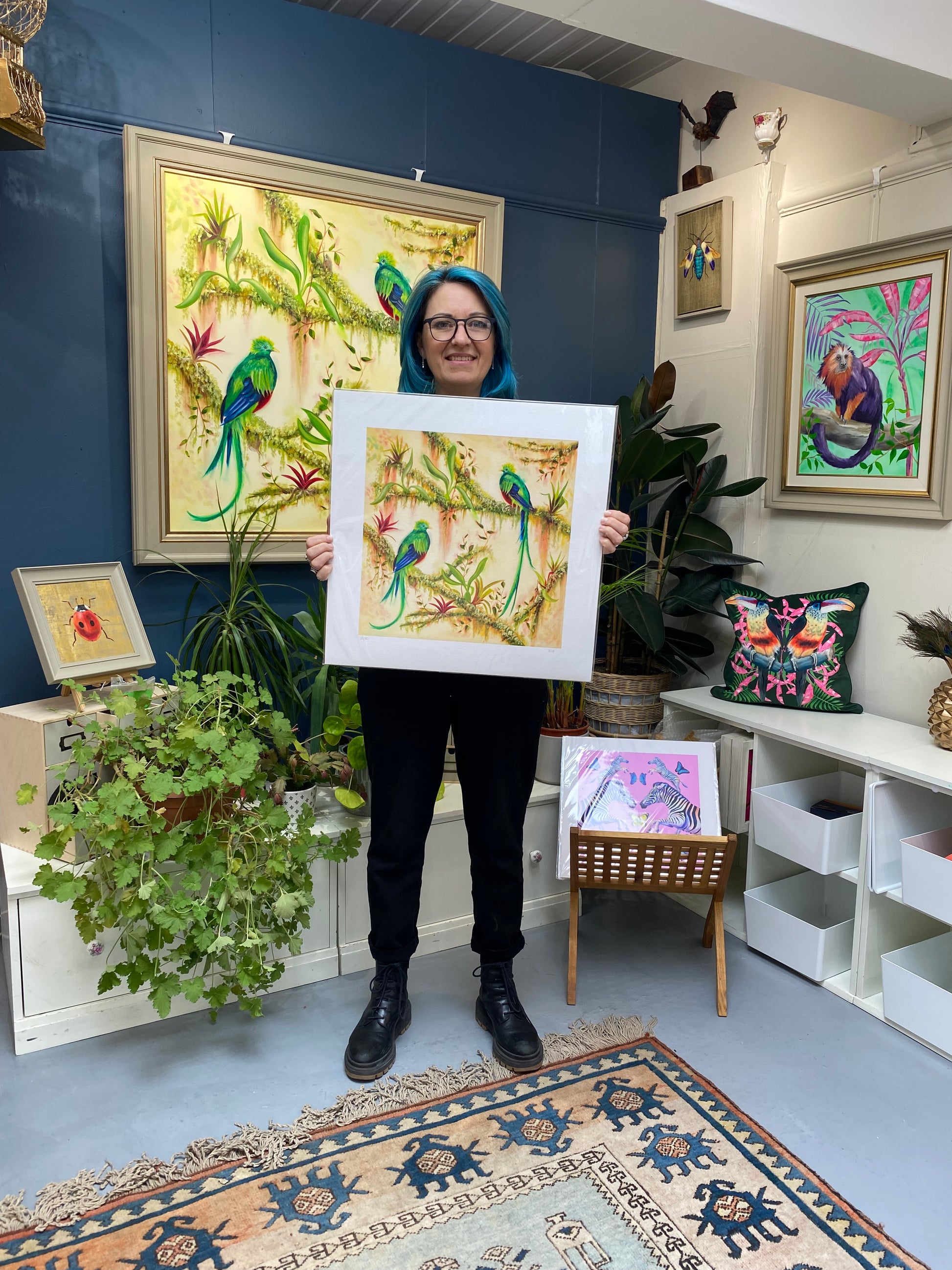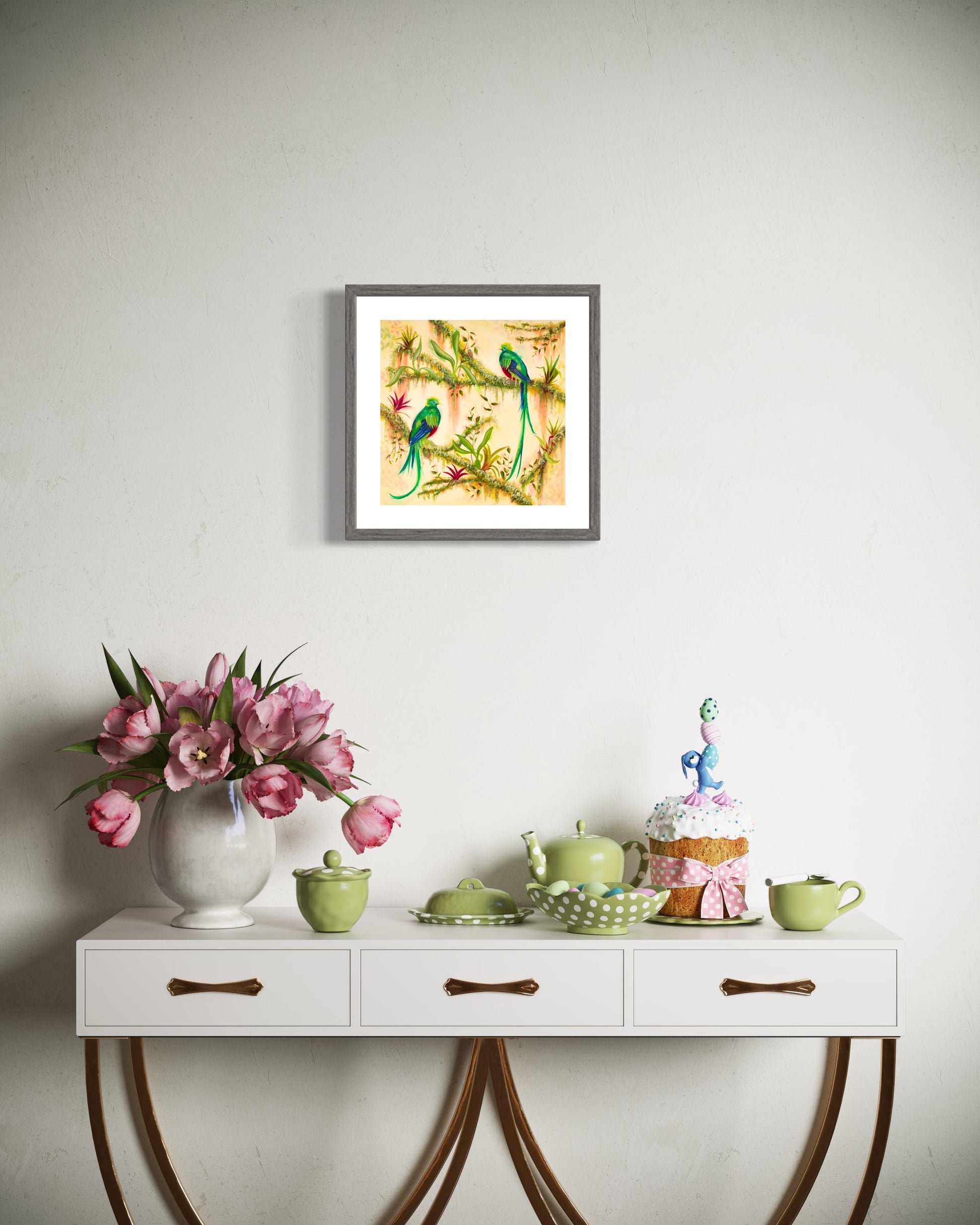Immerse yourself in the vibrant beauty of the rainforest with my stunning Resplendent Quetzal print. Featuring this dramatic birds striking emerald and crimson plumage against the lush foliage of the rainforest. Set against a featherlight, soft yellow, this is the centrepiece of any room.