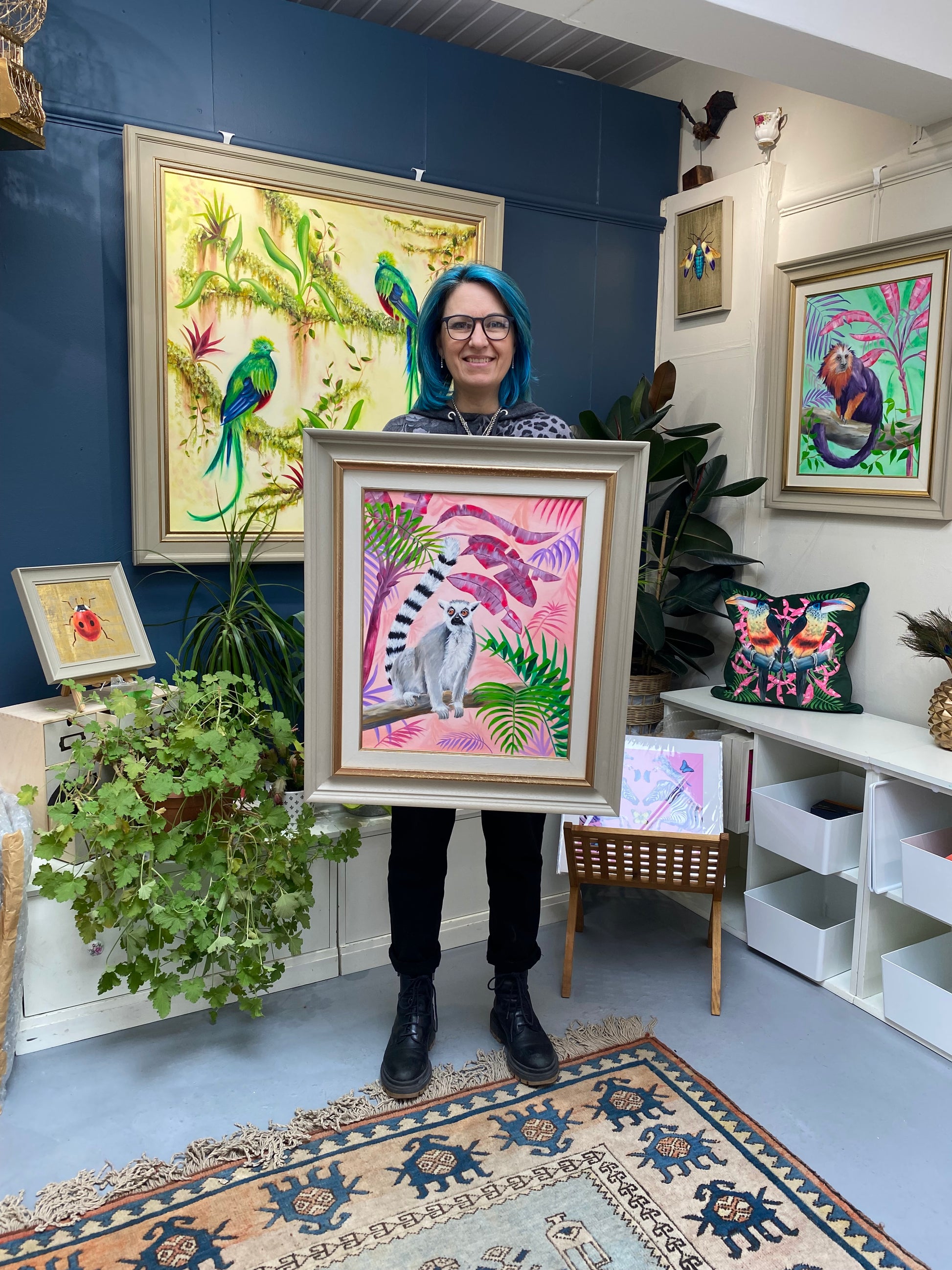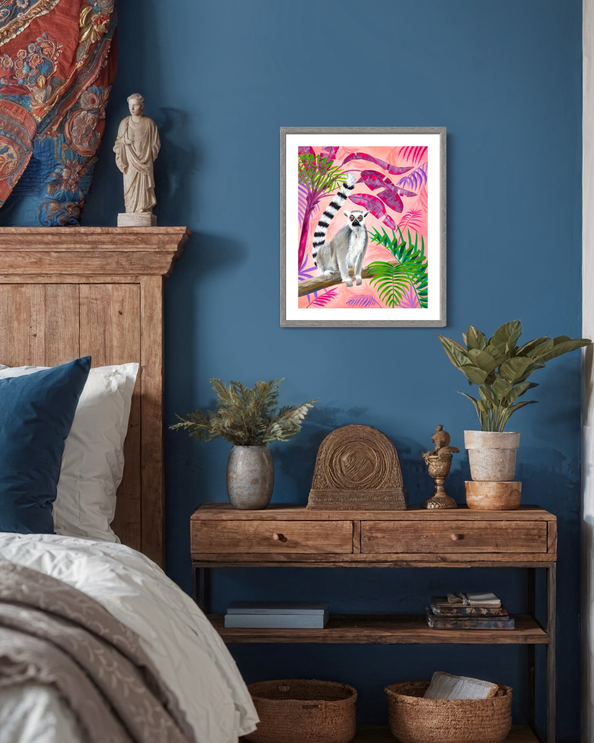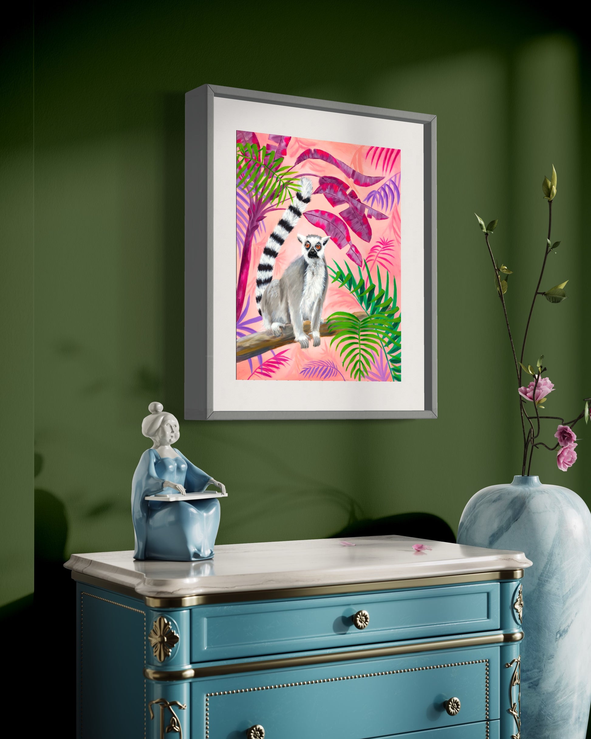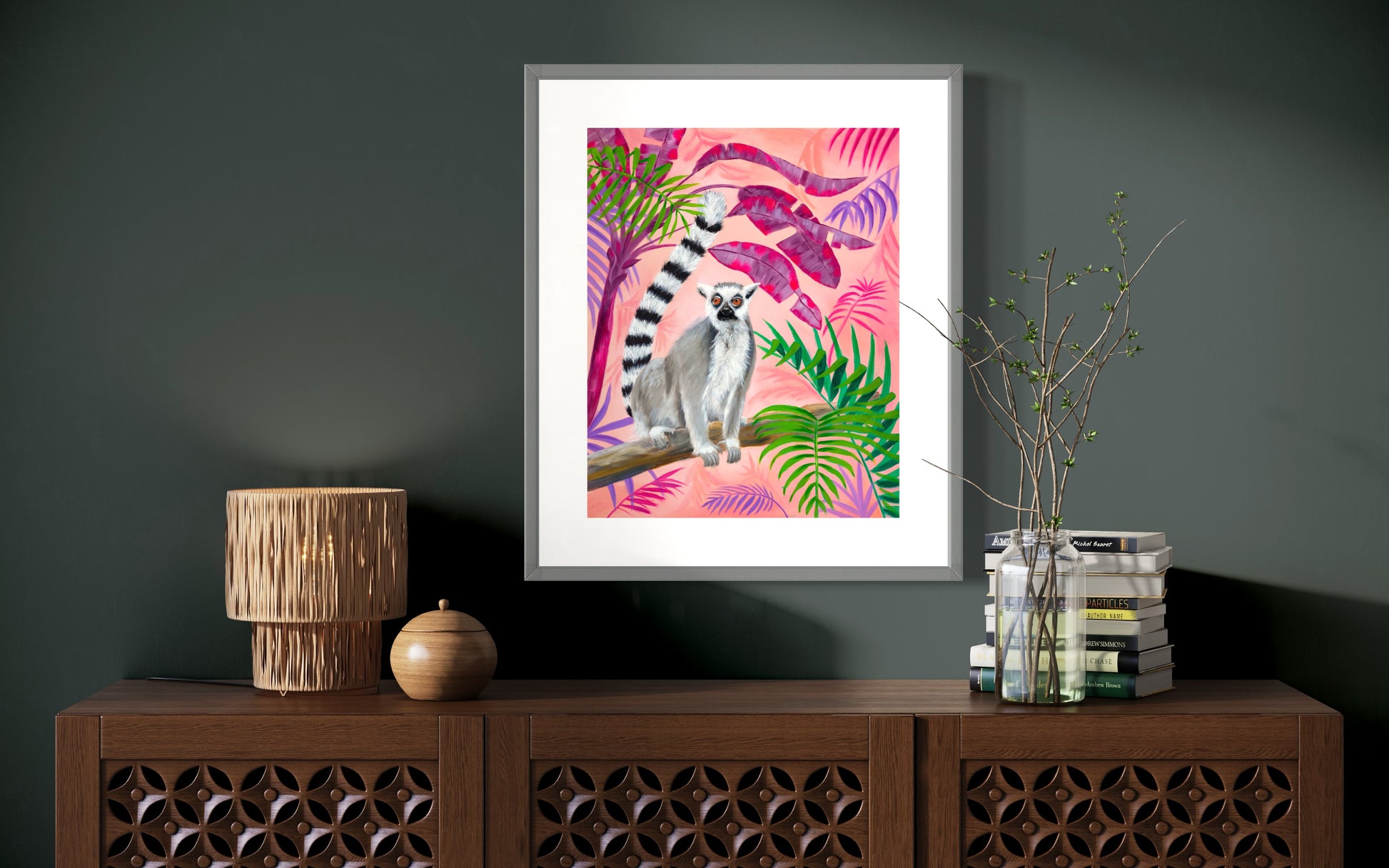 Add a hint of the wild and exotic to your interior with my Ring Tailed Lemur print. This vibrant print features the lemur with its characteristic black and white tail perched on a branch, exuding curiosity and poise. The background is a beautiful soft pink with bold green and purple foliage. The essence of tropical paradise!