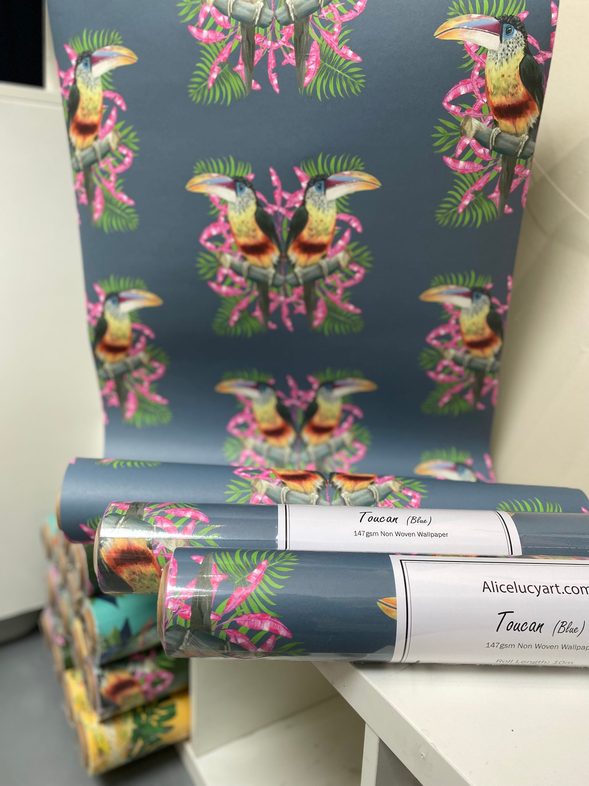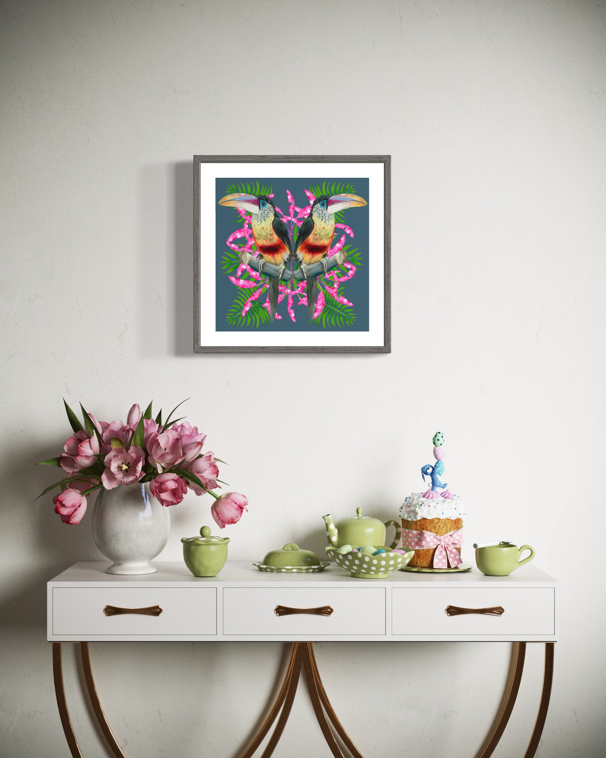 Taken from my original oil paintings and digitally collaged into a beautiful design, this vibrant curl crested Acari toucan, with tropical foliage celebrates the natural world. Adding a touch of colorful charm and maxilmalist elegance to any room with a richly layered aesthetic. The deep blue background perfectly compliments the bright pink of the banana leaves and the rich yellow of the toucan.