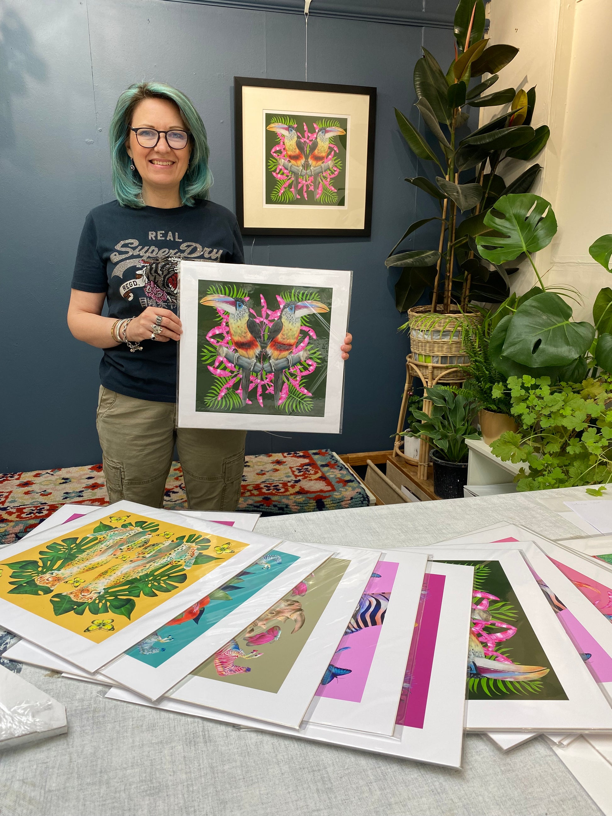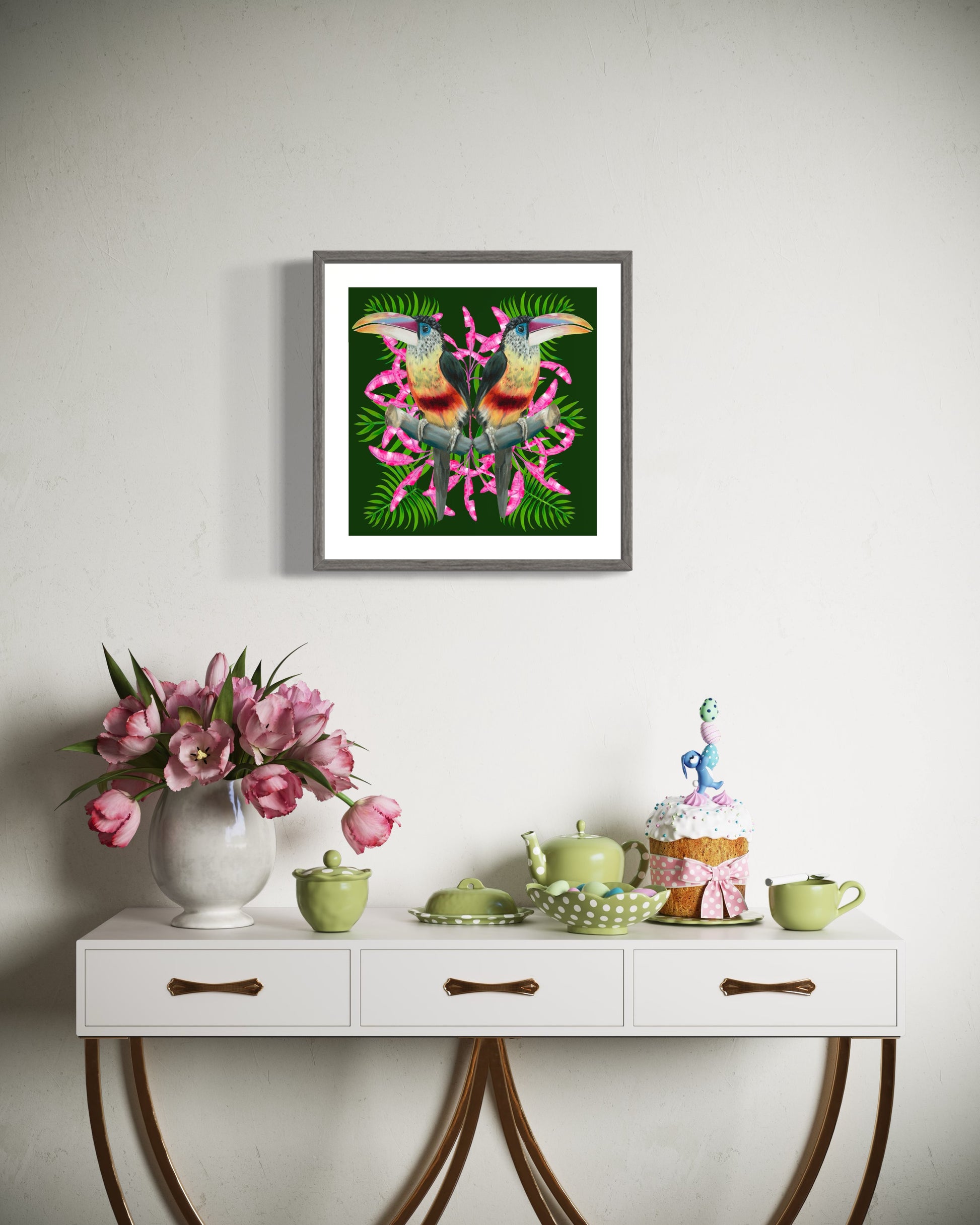 Taken from my original oil paintings and digitally collaged into a beautiful design, this vibrant curl crested Acari toucan, with tropical foliage celebrates the natural world. Adding a touch of colorful charm and maxilmalist elegance to any room with a richly layered aesthetic. The bold deep green background perfectly compliments the bright pink of the banana leaves and the rich yellow of the toucan.