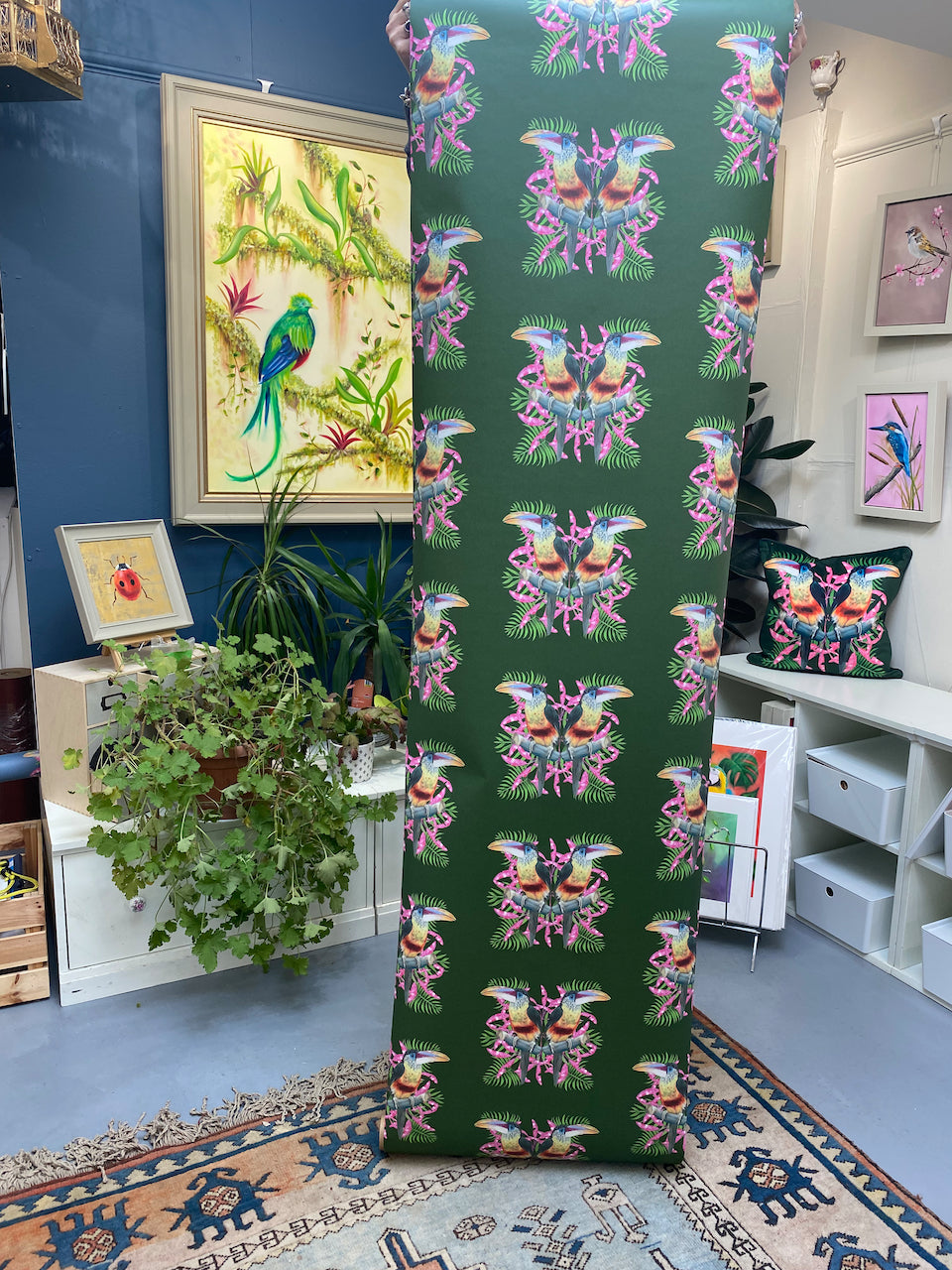 Inspired by my love of all things colourful this Toucan wallpaper is taken from one of my original oil paintings, and has been digitally collaged to create this stunning maximalist pattern. Also available in Blue.